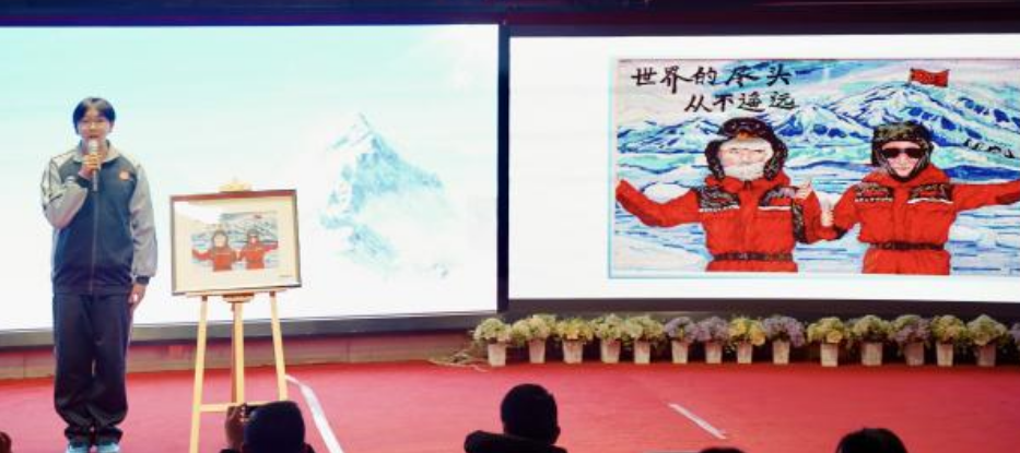本次活动特色在于“宣讲+体验+展示”的立体模式。学生们创作的南极主题绘画、写给科技工作者的信,不再是背景板,而是精神对话的延伸。当学生朗读信中提到的秦大河院士徒步横穿南极的故事时,“爱国、求实、创新、拼搏”的南极精神有了具体的偶像。当学生讲解画作《南极出征》《我们的征途是冰原》时,他们表达的是对“不畏艰难”“家国情怀”的理解与向往。VR眼镜的极地体验,虽短暂,却用科技手段拉近了学生们与那片神圣冰雪世界的心理距离。在最后一个环节,安教授向学生代表赠送科学家精神书籍,完成了从精神感召到鼓励传承的闭环。