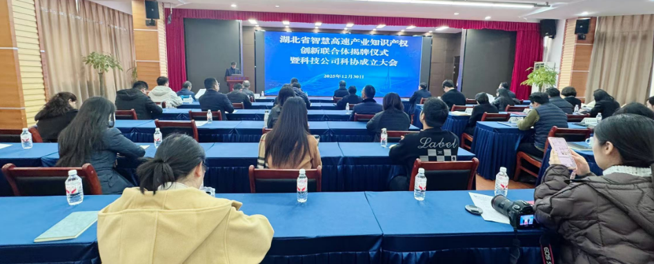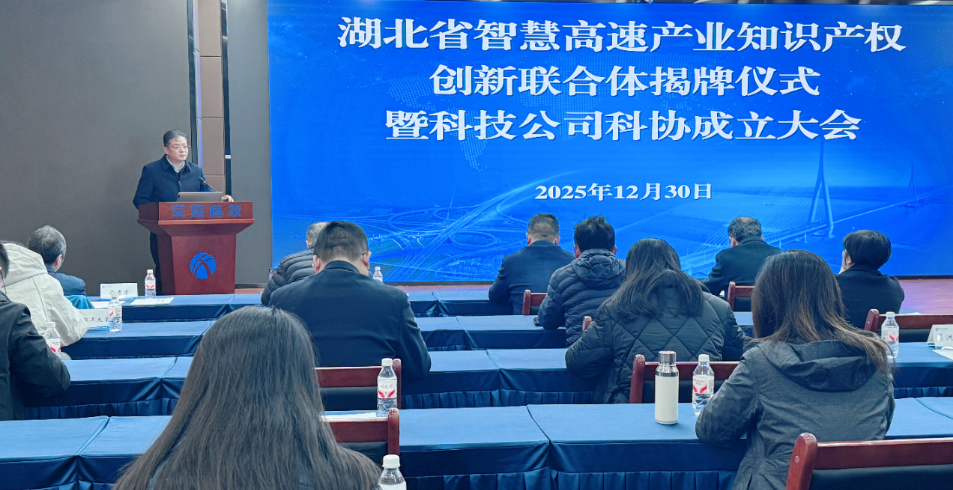 12月30日,湖北省智慧高速产业知识产权创新联合体揭牌仪式暨科技公司科协成立大会在湖北交投科技发展有限公司(以下简称“科技公司”)举行。武汉理工大学法学与人文社会学院院长刘介明,硚口区市场监管局(知识产权局)四级调研员黄斌峰,科技公司党委书记、董事长张再武,党委委员、纪委书记余文鑫,及交投集团、交投科技、武汉理工大学、智慧研究院、葛洲坝交投等联合体单位参加会议。硚口区科协党组书记、主席刘军,副主席佘德孝参加活动。科技公司党委委员、总会计师万家捷主持会议。