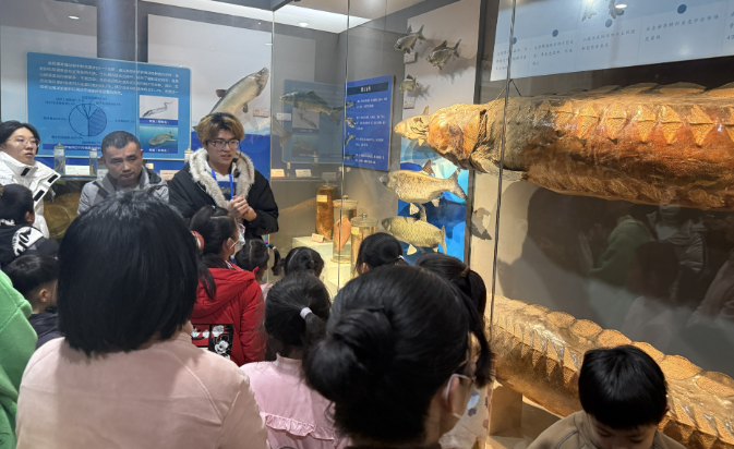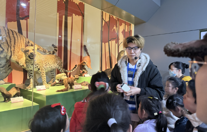 随后,大家移步华中农业大学博物馆,开启了一场奇妙的自然探索之旅。在“蛰鸣蛱趣”展厅,色彩斑斓的珍稀蝴蝶、形态各异的昆虫标本吸引着孩子们的目光;“野性自然”展区,栩栩如生的东北虎、扬子鳄等野生动物标本,让大家近距离感受生物多样性的魅力;“本草芳华”单元中,承载着植物奥秘的标本藏品,让孩子们在观察中读懂自然与生命的关联。讲解员用通俗易懂的语言,讲解动植物的生存智慧与生态保护的重要意义。孩子们时而驻足凝视、时而举手提问,好奇的目光里满是对科学的向往,家长们也在一旁认真聆听,与孩子共同探索自然奥秘,在互动中拉近亲子距离。