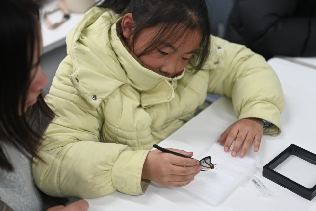 最让孩子们期待的是蝴蝶标本制作体验环节。孩子们在志愿者的指导下,小心翼翼地用镊子整理蝴蝶翅膀,将其姿态仔细固定于展板上,并认真标注信息。从观察、了解到亲手制作,孩子们将理论付诸实践,不仅学习了标本保存的科学方法,更在实践中体会到科学探究的严谨与乐趣。当一件件精美的蝴蝶标本在手中逐渐成型,他们的脸上也洋溢着收获的喜悦。