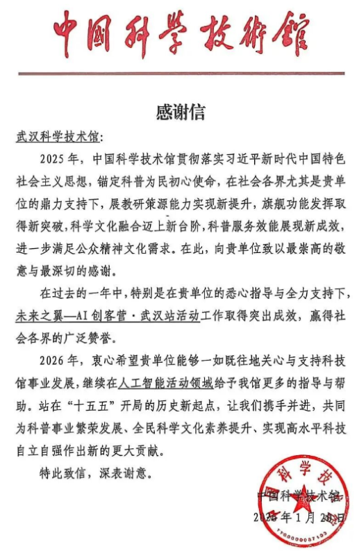 日前,武汉科技馆收到来自中国科学技术馆的感谢信。信中对武汉科技馆在2025年全力参与并支持由中国科学技术馆牵头主办的“未来之翼-AI创客营·武汉站”活动所取得的突出成效表示高度认可与衷心感谢。