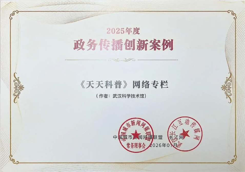 与此同时,武汉科技馆精心打造的《天天科普》网络专栏再传捷报,荣获“2025年度政务传播创新案例”奖项。该奖项由中国城市新闻网媒联盟与长江网联合颁发,旨在表彰在政务信息传播、公共服务推广及网络内容创新方面表现突出的优秀案例。