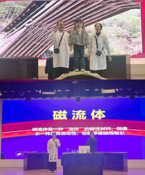 另一场实验秀《魔力磁液》则带领同学们走进了神秘的材料科学世界。当黑色的磁流体在磁场作用下瞬间“长出”尖刺,变幻出各种奇妙的造型时,现场爆发出阵阵惊叹。辅导员深入浅出地讲解了磁流体这一新型功能材料的特点与应用,让同学们在“魔法”般的现象中,窥见了前沿科技的魅力。