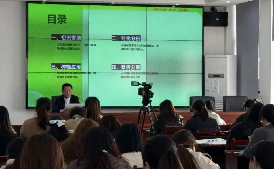 活动特邀新洲区三店街农业技术服务站站长黄慧军主讲,主题为《让根系呼吸:雾培与可持续农业》。授课过程中,黄站长将图文讲解、现场视频演示、实践案例分享融为一体,用通俗语言系统讲解气雾栽培这一现代农业前沿技术。他用“无土种植、喷雾供养、立体种植”三个要点概括雾培核心特点,重点讲解这项技术与传统土培、水培的区别,突出其省水、省肥、省空间、生长更快、产量更高等优势,现场解答大家对无土栽培的疑问,破除认知误区。