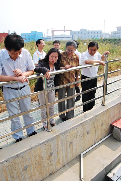 武汉新天达美科技有限公司总经理陈美杉(左2)向副主席张太玲(右2)介绍他们研发的“STCC碳系载体生物滤池技术”。