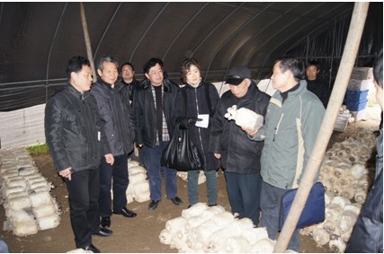 市科协杨军副主席(右三)、华中农业大学李名家副校长(左三)调研东西湖区辛安渡办事处红星大队移民村福农益民农业发展公司食用菌种植示范基地。