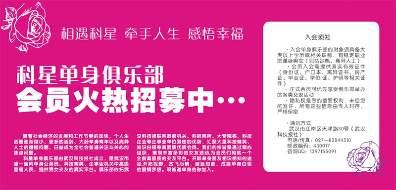 科星单身俱乐部由武汉科技报社成立,是武汉市唯一面向单身公务员、科技精英、企事业机关中高级管理人员,提供男女交友的真实平台。俱乐部依托武汉科技报联系政府机关、科研院所、大专院校、科技企业等企事业单位紧密的优势,汇聚大量科技精英、知识白领等高素质优质会员。我们的宗旨是通过精心组织,策划丰富多彩的交友活动,为会员们构筑一个全新高品质的交友平台。开辟单身朋友相识相知的途径,开拓视野,放飞心情,邂逅知音,成就单身白领的爱情梦想。现诚邀单身的你加入,报名办法及细则请登陆科星网(http://kexing100.com/jiaoyou/jiaoyou.htm)