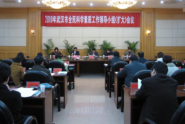 4月14上午,2010年武汉市全民科学素质工作领导小组(扩大)会议在市政府会议礼堂召开。市委常委、副市长岳勇到会并作重要讲话,市委常委冯记春出席会议。会议由市政府副秘书长杨国成主持,市素质办21个成员单位负责人、13个区分管领导以及各区素质办主任参加了会议。