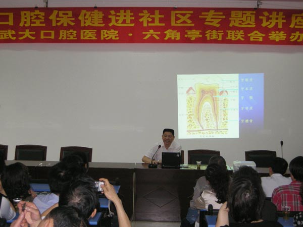 武汉口腔医院门诊主任医师徐东选博士为百余名社区居民详细讲解了口腔知识。他利用幻灯片的形式,列举了大量的图片及医学实例,图文并茂、深入浅出的为大家讲解了乳牙龋齿的危害性、儿童龋病的预防、儿童窝沟封闭、牙齿矫正的最佳时期及龋病的病因及治疗,还详细讲解了口腔的修复和注意事项。徐博士的讲课引起了大家的极大兴趣,大家纷纷根据自己的口腔情况进行现场咨询。