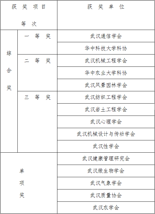 根据武科协〔2014〕15号《关于组织实施2014年度学会能力提升专项的通知》,经过专家评审委员会评审,共评出综合奖10个,其中一等奖二名,二等奖三名,三等奖五名;单项奖5个,现予公布。