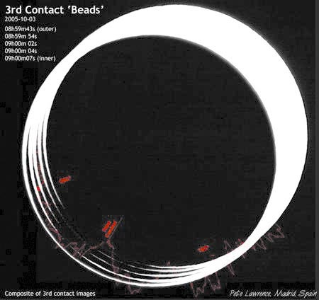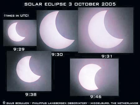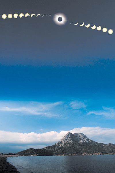 拍摄于土耳其附近的安卓山,这张数字影像记录了月亮穿过太阳与地球之间的数个阶段;在最中间的定格,可见到月亮完全遮掩太阳的日全食,当时全黑的月面周围镶着太阳壮观的日冕。