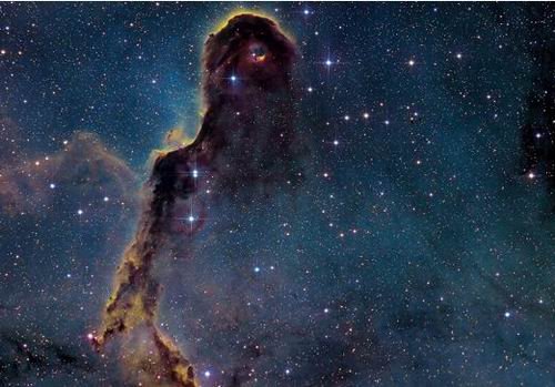 如图所示,这是IC 1396星云,它是最大的可观测星云之一,其直径是太阳直径的2500倍。该星云的灰尘和气体云是由周边恒星辐射物质形成的。