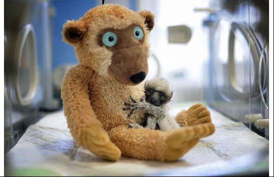 这只马达加斯加狐猴名叫塔希娜,不久前刚刚出生于法国贝桑松动物园。据悉,这种狐猴是世界上最小的灵长类物种之一,主要生活于马达加斯加岛。然而,由于受到人类活动和环境污染的影响,狐猴自然栖息地遭到了严重破坏,这一物种正濒临灭绝的边缘。在全球范围内,也只有17只生活于人工喂养环境的马达加斯加狐猴。图中这种马达加斯加狐猴就是人工培育出来的,所以刚刚出生的它把泰迪熊当成了自己的母亲。
