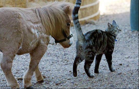 科达是一匹美国微型马,而且生来就是一个侏儒,身高比猫大不了多少。图中,它正在亚拉姆巴特家畜医院中与一只小猫悠闲散步。