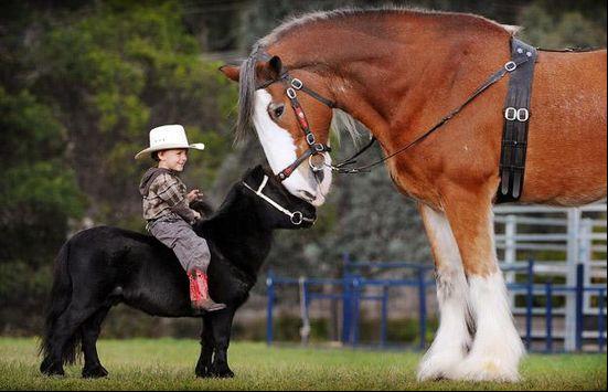 在澳大利亚墨尔本,两岁大的小男孩科尔特-布伦跨下的微型小马普朗策与庞然大物般的克莱兹代尔马行“贴面礼”。克莱兹代尔马是一种产自英国苏格兰克莱德的名马。