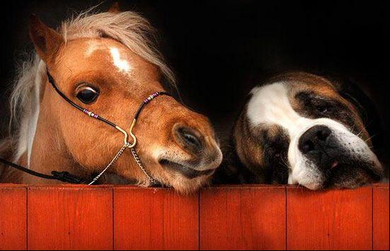 一头微型小马和一只名为埃尔莎的圣伯纳犬正伸头向门外张望。它们生活于英国康沃尔郡。