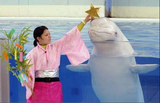 在日本横滨一家水族馆中,一名训练员正在引导一头白鲸表演节目。