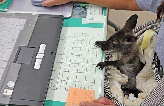 在日本东京“Edogawa Natural”动物园中,一只小袋鼠幼仔正坐在动物园管理员的膝盖上学习打字。由于被妈妈歧视,这只小袋鼠幼仔生活处境曾经非常可怜。后来,动物园管理员把它抚养长大。