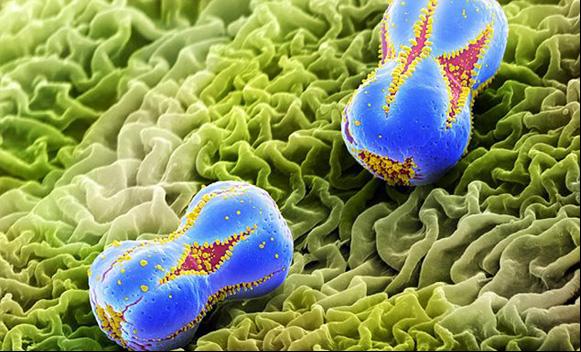 勿忘我花瓣中的花粉颗粒。这些颗粒的直径只有0.006毫米,属于最小的那种。