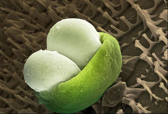 带有粉红色斑点的绿色捕蝇草花粉颗粒。虽然捕蝇草未必比勿忘我大出多少,但它的花粉微粒约却比勿忘我花粉大许多。