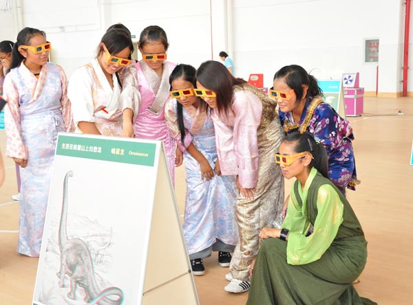 西藏中学的同学们观看以恐龙世界为主题的3D展板图片。