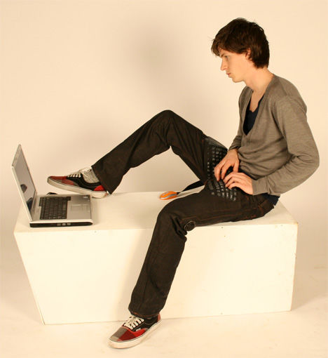 这其实是一款非常有趣的牛仔裤,它在前裆的位置上融合了一个柔软的键盘这样就不必担心键盘掉落了;而鼠标则绑在裤子的一侧,可以随手放到裤兜里,需要的时候只要拿出来放在腿上使用即可。