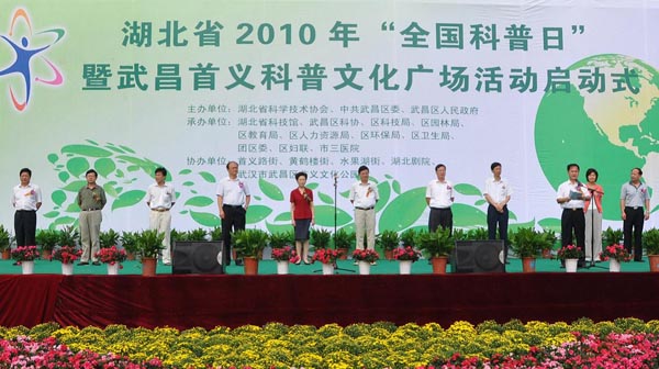 启动式上吴志振区长致辞,九龙井小学的学生宣读了“爱地球、环境、重健康、低碳生活”从现在做起的倡议书,省科协党组书记曲颖讲话。副省长郭生练宣布2010年湖北省科普日暨武昌首义文化广场活动启动。