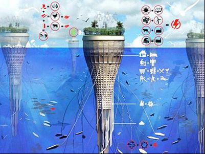 这些“触须”有三大重要作用:其一,通过与海潮同一节奏的摆动,可以产生和积蓄能量;其二,它是建筑物的平衡和稳定系统,大楼能始终保持垂直竖立状态;其三,还可以为大量海底动物提供聚居的场所。据设计师萨克姆介绍,“水下摩天楼”采用了各种先进的环保技术,发电全部依靠可再生能源。此外,摩天楼还能通过耕作、水产养殖和水栽培技术为自身生产大量品种繁多的食物。最后,通过废物回收和循环利用技术,它对环境不会有任何破坏和影响。