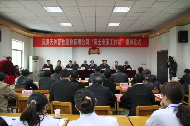 12月10日下午,武汉天种畜牧股份有限公司院士专家工作站揭牌仪式在我区隆重举行。仪式由武汉院士咨询服务中心秘书长、巡视员张太玲主持,省科协党组成员、秘书长李莹宣布天种院士专家工作站正式成立。市政府副市长邢早忠、副秘书长姜铁兵、区政府区长吴祖云和武汉院士咨询服务中心秘书长、巡视员张太玲为工作站揭牌。市政府副秘书长姜铁兵向特聘院士熊远著颁发聘书,区长吴祖云为揭牌仪式致辞,副市长邢早忠作了重要讲话。