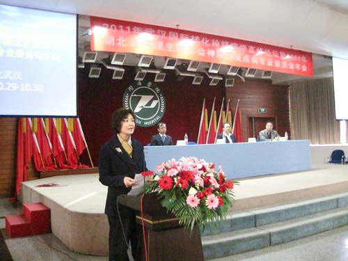 10月28-30日,、武汉市病理生理学会在武汉同济医院共同举办的2011武汉国际转化神经病学高峰论坛圆满举行。图为本次大会名誉主席、副主席杨军为大会致辞。
