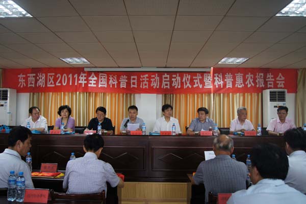区委副书记张明权代表区委、区人大、区政府、区政协在启动仪式上讲话并宣布东西湖区2011年全国科普日活动启动。他要求各单位要积极动员和组织广大科技工作者、科普工作者和科普志愿者,围绕““节约能源资源、保护生态环境、保障安全健康、促进创新创造”主题,突出“水情、水利、水资源”的重点,面向基层,深入社区、农村、机关、企业、学校等,运用讲座、报告、咨询、培训、展览、演示、竞赛等形式,结合实际,开展丰富多彩、惠民益民的科普日系列活动。