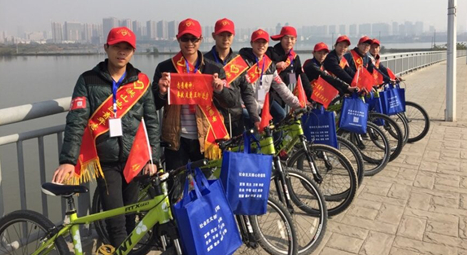 工程大社区10名青年志愿者代表卓刀泉街参加了此次活动,志愿者们环南湖骑行,全程22.8公里,并沿途发放志愿者环保袋和笔记本。虽然不是专业骑行队伍,但是每个队员都尽力去宣传志愿者的奉献互助精神,并受到热情的市民们的鼓励和支持。