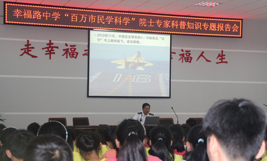 9月11日下午3时,邀请海军工程大学浦金云教授到区幸福路中学为初二学生作了航空母舰发展的科普报告。课堂上学生用神奇和敬仰的目光注视浦金云教授用自己的经历和科研成果介绍我国航空母舰的发展历程和现状,讲解海军舰船发展和国防安全等方面的知识,增添了对军事科学的兴趣和对我国军事事业的关心。