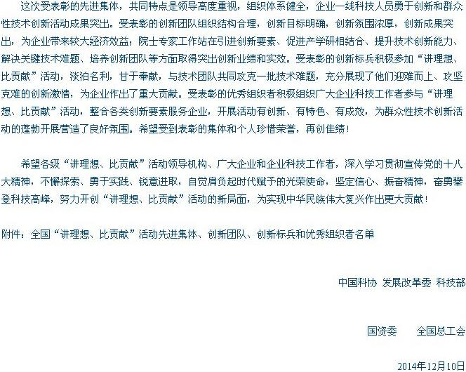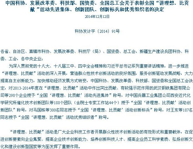 经湖北省科协向中国科协推荐申报,中国科协、发展改革委、科技部、国资委和全国总工会联合发文公示(科协发计字【2014】91号),表彰了全国2014年“讲理想、比贡献”活动先进集体、创新团队、创新标兵和优秀组织者,硚口区科协推荐的武汉三新材料孵化器有限公司联合科协主席艾青同志荣获全国“讲理想、比贡献”活动“优秀组织者”。