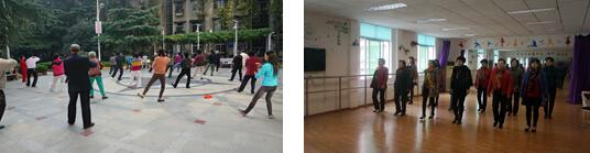 早上8:15分,社区科普文化广场上,太极拳队准时开课。放松、起势、左右野马分鬃、白鹤亮翅、左右搂膝拗步、手挥琵琶……队员们跟着苏老师温习着上学期刚学完的24式太极拳,9:00时整,社区四楼文化娱乐活动室内,响起了动感的时尚走秀音乐,社区时装队也准时开课。脚尖着地,脚绷直,小腹紧收,正在练习走台步的队员们跟着音乐节拍,手臂自然的摆动,煞有几分专业劲。