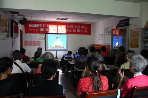 5月22日上午9时,江汉区北湖街环保社区联合江汉区图书馆为辖区40余名中老年朋友播放了电教片《饮食与夏季养生》,由武汉市小蓝鲸酒店有限责任公司董事长刘国梁先生主讲。