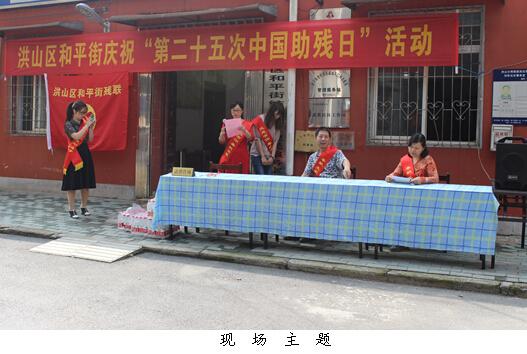 纺机社区工作人员和理工大学航运学院志愿者对参加活动的残疾人朋友一起发放调查问卷,认真填写,在循环播放歌曲《感恩的心》《祝您平安》《隐形的翅膀》“助残日”主持人和社区主任对参加和平街“全国助残日”的残疾朋友们送上小礼品,送上祝福,祝和平街全体残疾人朋友生活愉快,万事如意,一生平安。