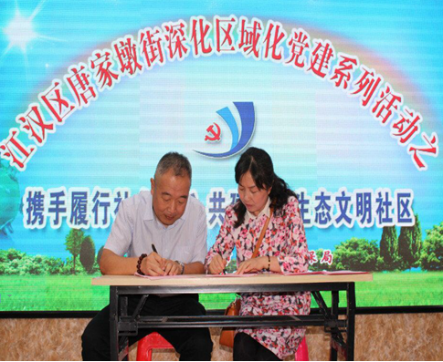 为深化共驻共建工作,促社会责任履行,推进社区环保建设,2015年5月26日早上九点, 唐家墩街西桥社区联合共建单位江汉区环保局开展区域党建系列活动之“携手履行社会责任,共建绿色生态文明示范社区”启动仪式。旨在通过一系列专业环保志愿活动,增强居民的环保意识,形成低碳生活、低碳出行、抵制污染人人有责的局面,从而引导居民参与绿色生态文明示范社区建设, 共同“营造绿色城市,呵护绿色家园”。