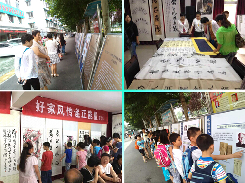 在四新社区二楼展示厅和社区大门路边摆满了展示作品,有社区书画家的书法作品60余幅,有市区科协、市区妇联提供的名谱巡礼、四海一家、啜英咀华、千年传颂四个板块组成的中国家谱家训族规展板。