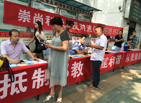 自开展“无邪教创建”示范街道和示范社区活动以来,武昌区杨园街积极贯彻落实上级创建活动精神,认真抓好创建“无邪教创建”活动的基层基础工作。近日,街综治维稳中心与司法所联合组织开展了一次以“崇尚科学,拒绝邪教”为主题的宣传活动。活动主要采取制作反邪教宣传展板、设立宣传咨询台、悬挂横幅、发放宣传资料等方式,向群众开展反邪教宣传活动。