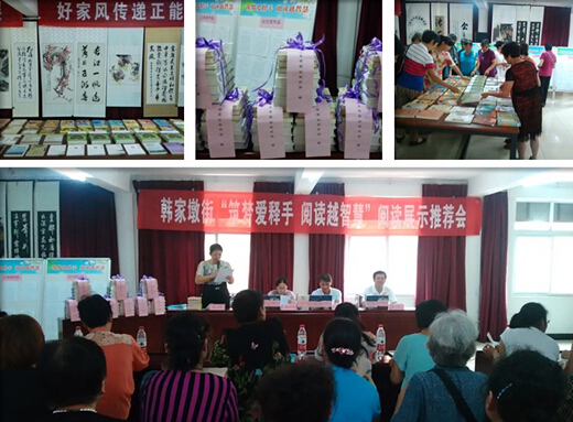9月22日,在四新社区内,周围精美书画环绕,书画展台、科普书籍展台布置朴实典雅、“筑梦爱释手 阅读越智慧”获奖征文展架围满了前来欣赏的居民群众。街妇联主席、科协秘书长赵霞玲通报了韩家墩街2015年特色读书活动情况,区科协黄来生副主席、区妇联副主席刘纯共同为获奖者颁发了奖证和奖品。展示会上举行了向各社区赠书仪式,并向参会者宣读一份全民阅读倡议书。