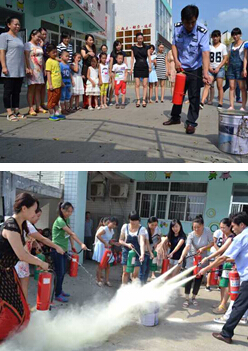 教师们学习了如何报警、火灾的预防、火场自救及逃生等消防安全基本常识,为了让理论和实践相结合,幼儿园安全管理人员还现场演示了灭火器的操作程序,并让老师们亲自体验灭火器灭火的过程,使全园教师掌握了正确使用灭火器的方法。