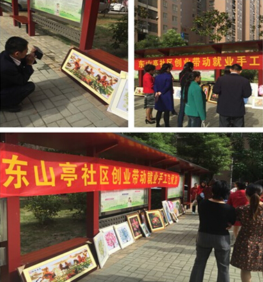 2015年10月11日下午,东山亭社区开展“创业带动就业手工艺展览”主题活动。当日,社区30余位妇女巧手绣制的花卉、人物、风景等作品在广场上进行展出,这次除了十字绣还有新颖的钻石绣。小狗的活泼调皮、玫瑰的艳丽高贵、迎客松的气派等都被惟妙惟肖地展示出来。在参展的绣品中,以方利荣1.6米长的迎客松全景绣最为瞩目。居民们看了后都啧啧称赞。展览吸引了不少十字绣爱好者前来参观,为社区居民们献上民间艺术大餐。