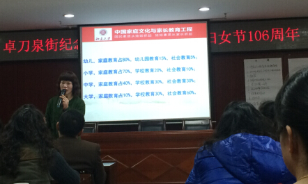 3月4日上午9点,洪山区卓刀泉街科协联合街妇联在街机关708会议室开展了一场“家庭成长教育”科普讲座,街道及各社区近50人参加了此次活动。本次活动特邀请“北京大学家庭文化与家长教育研究所”张晓阳老师主讲。在课程中,张老师以翔实的案例、经典的分析,深入浅出的道出了家庭教育必须从小做起。详细介绍了如何提高家庭教育的能力,如何发现问题以及如何科学解决问题的方法以及父母与孩子的关系是孩子最先面临的一种重要的社会关系。张晓阳讲师以海量的知识理念,告诉大家:能够担任激发孩子学习动力重任的不二人选就是父母。