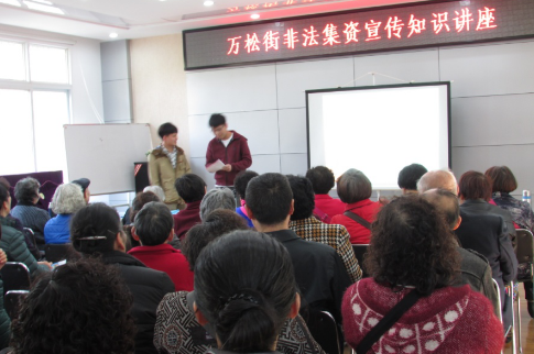 近几年来,非法集资扰乱社会经济秩序,破坏市场经济法则,已成为影响社会稳定的重大隐患。王老师通过四个典型的案例:深圳的e租宝案例、名人代言的理财产品、网络上虚拟货币案例以及专门针对于老人“养老项目”投资的案例,向大家揭示这些骗局的常见手段:承诺高额回报、编造虚假项目、以虚假宣传造势、利用亲情诱骗。提醒大家对那些高收益回报的财富公司要保持高度警惕,不要被所谓的高收益所蒙敝,一生血汗钱到最后血本无归。现场还请江汉大学的学生用生动的小品表演向居民群众介绍了几种非法集资的常见手段。并给予了居民专业的意见和建议。