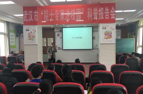 2016年3月16日下午3:00,“院士专家进校园”科普报告会在汉口回民小学举行,中科院武汉物数所雷皓研究员对学校高段学生进行了《网瘾的危害与预防》专题讲座。