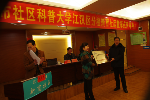 2016年1月15日上午9点,江汉区新华街新育社区科普大学开学典礼仪式在社区党群服务活动中心举行,江汉区科协主席钟家伟、副主席徐子聪、新华街工委书记杨俊、工委副书记张文、街办事处副主任陈幼儿明、社区书记、主任龚华珍等80多人参加此次开学典礼。