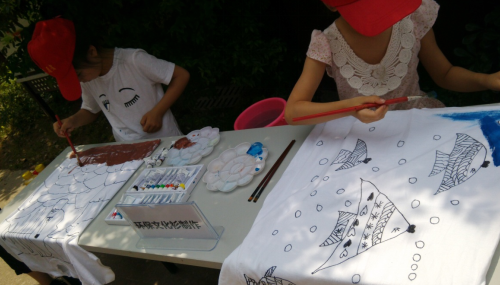 两位同学用她们灵巧的小手勾勒出不同环境里生活的小鱼儿。一位小朋友文化衫创作的内容讲的是生活在深海的一群大小鱼儿,海水很蓝,它们自由自在的在海水里吐着泡泡,互相嬉戏游玩着,它们的每一天都过得很快乐;另一位小朋友文化衫创作的内容讲的是一只干死在沙滩上只剩下骸骨的鱼,眼前茫茫一片是干涸的土地,不远处密密麻麻的都是小鱼的骨骸。这只鱼死前流下了最后一滴眼泪,眼泪里充满了它对以前在深海家里快乐生活的思念。两位小朋友用她们笔下生动形象的画面向居民朋友们宣传了环境保护的重要性、水土资源保护的重要性。