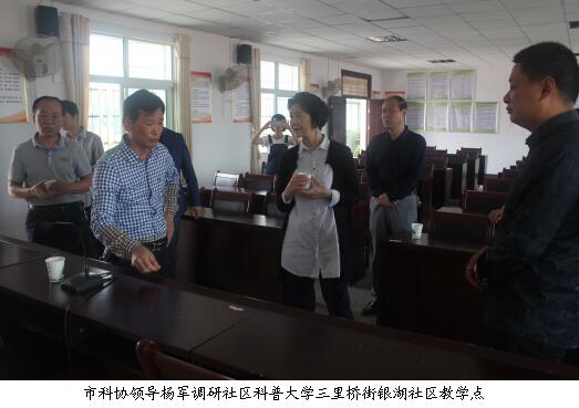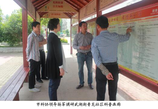 5月17日上午,市科协副主席、纪委书记杨军一行参加完黄陂区2016年科技活动周启动仪式之后,深入到我区武湖街胜海社区、青龙社区及三里桥街银湖社区进行调研,指导我区基层社区科普工作。市科协科普部部长王景跃、区科协主席熊克彪、各社区负责人陪同调研。