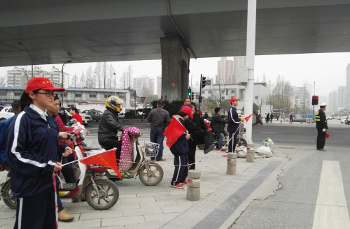 活动过程中,学生们看红绿灯提示,通过拉起,放下红丝带简单重复的动作,时刻着警醒人们“平安出行,人人有责”的交通规则。期间,当红灯亮起时,有位老太太预备越过红线,学生们见状立即上前阻止,在孩子们耐心劝导下,老太太终于心平气和等绿灯亮时才过了马路。
